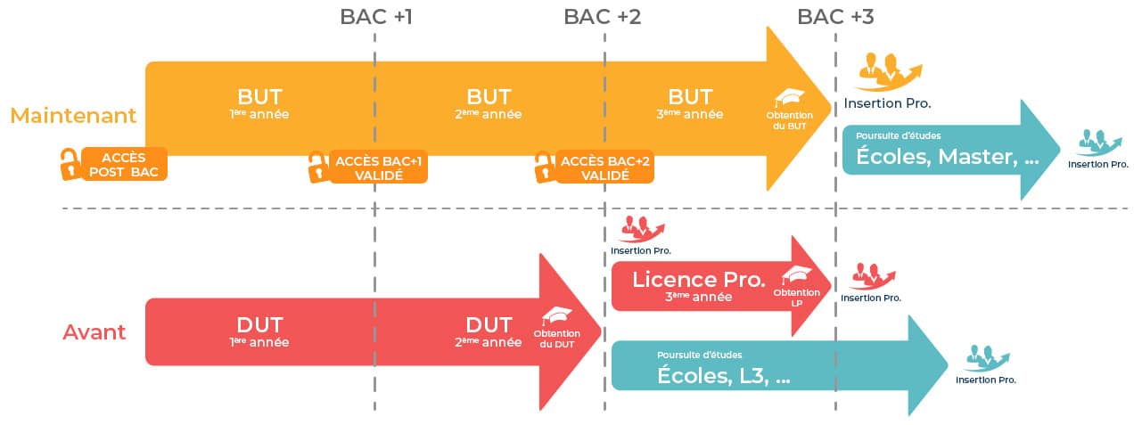 – la durée : le cycle complet de BUT est de 3 années au lieu des 2 années de DUT.